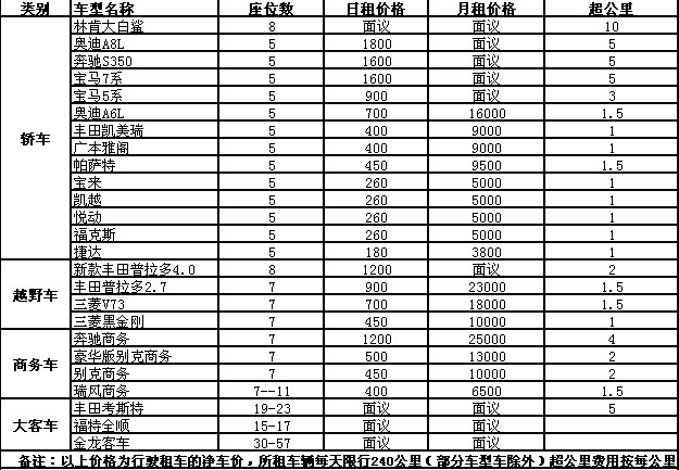 2015年底榆林租車公司最新報價表